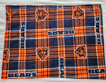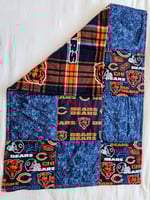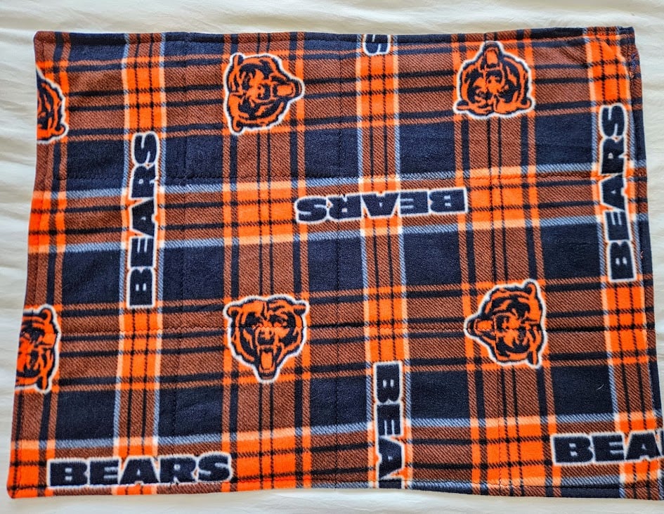 Cotton-blend patchwork quilt with light batting middle layer and a soft Bears print fleece backing. Quilted top stitching for durability