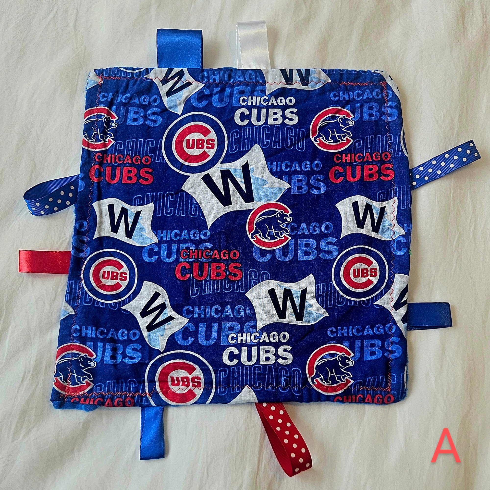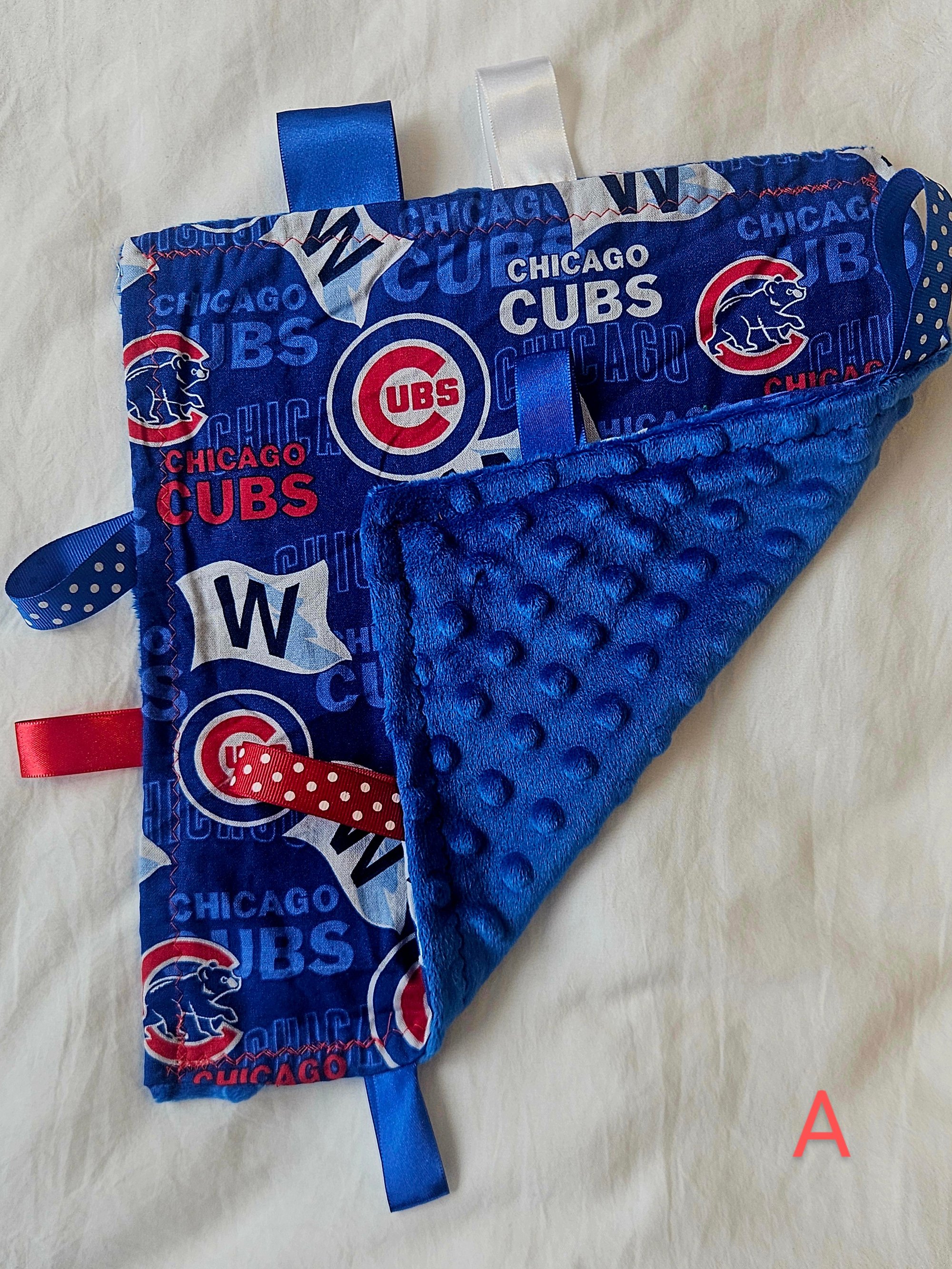 Featuring Chicago Cubs-themed fabric, a plush minky backing, and textured ribbon tags for tactile exploration, it’s perfect for soothing, teething, and play.