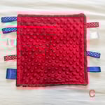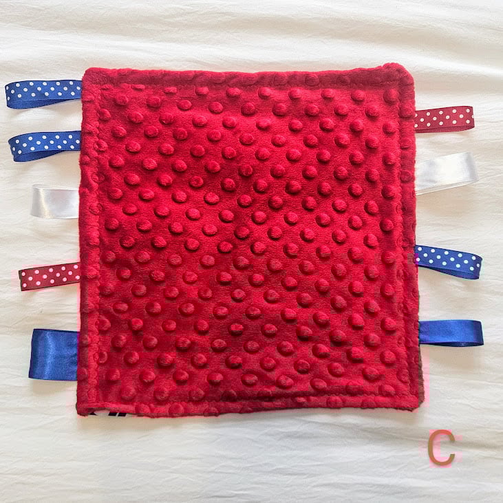 Featuring Chicago Cubs-themed fabric, a plush minky backing, and textured ribbon tags for tactile exploration, it’s perfect for soothing, teething, and play.