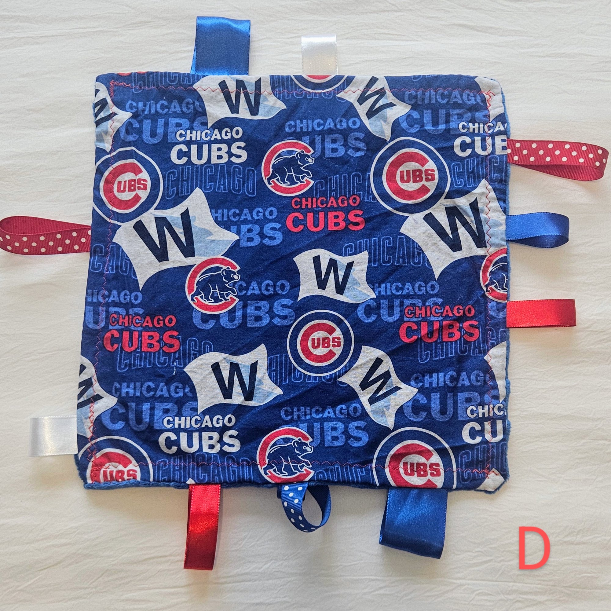 Featuring Chicago Cubs-themed fabric, a plush minky backing, and textured ribbon tags for tactile exploration, it’s perfect for soothing, teething, and play.