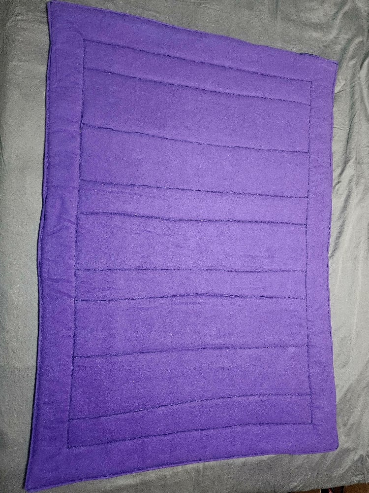 toddler-size patchwork quilt features purple fleece backing, lightweight quilt batting for extra warmth, and a playful mix of rainbow cats, unicorns, sparkling galaxy prints, and navy fabrics. The quilt is skillfully stitched with a "stitch in the ditch" zigzag technique for durability